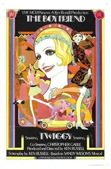 The Boy Friend is a 1971 British musical comedy film written and directed by Ken Russell, based on the 1953 musical of the same name by Sandy Wilson. The film stars Twiggy, Christopher Gable, Tommy Tune, and Max Adrian, with an uncredited appearance by Glenda Jackson.[3] Metro-Goldwyn-Mayer made extensive edits to the film for its American release. The missing material was restored and the film was re-released in 1987.[4] The Boy Friend was released on DVD on 12 April 2011.