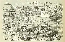 Leech and à Beckett first collaborated on their The Comic History of England (18471848), for which Leech had produced broadly humorous etchings.[4] He created still finer illustrations to The Comic History of Rome (1851)[5]— which, particularly in its minor woodcuts, shows some exquisitely graceful touches, as witness the fair faces that rise from the surging water in his illustration 'Claelia and her Companions escaping from the Etruscan Camp.'