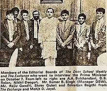 Founded by Arthur Foot in 1936, The Doon School Weekly is owned by Indian Public Schools' Society, the governing society of The Doon School. For the first three years of its existence, the newspaper was produced using a cyclostyle, and then moved to a printing press.[7] A number of the Weekly's contributors or editors are today working as authors, journalists, academics or politicians. The list includes Booker Prize-nominee Amitav Ghosh (class of 1972); playwright, poet and novelist Vikram Seth (class of 1970); editors, reporters and columnists for The Economic Times, Forbes, The Wall Street Journal, Hindustan Times, The Washington Post and The New York Times; a number of staff writers for The Times of India newspaper such as Swaminathan Aiyar and veteran editor B G Verghese, including broadcaster Karan Thapar (class of 1971), historian Ramchandra Guha (class of 1973), and politician Mani Shankar Aiyar (class of 1967); and Hindi language writer Vishvjit Singh (class of 1964); Foreign Secretary Uma Shankar Bajpai (class of 1936); Wajahat Habibullah (class of 1963) and Inder Pal Khosla (class of 1954); television-presenter Prannoy Roy and Tejeshwar Singh (class of 1965); and Mahmood Farooqui (class of 1979).[8][9][10] On April 14, 2018, the Weekly published its 2,500th edition, commemorating 82 years of its existence. The edition includes contributions from previous chief-editors such as Karan Thapar, Kanti Bajpai, Rahul Bhagat and Govind Dhar.[11][12]