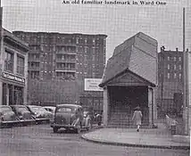 In recent years municipal and state authorities have sought to redevelop the neighborhood as a startup company incubator and cultural center through the creation of the Innovation District and Canalwalk. Proposals have also been put forth for redevelopment of the historic H. H. Richardson train station as well as the Hotel Jess/Perkins Block.[5] While not on the National Register of Historic Places, the latter holds historical significance as it was constructed by Benjamin F. Perkins, a contemporary of Alexander Graham Bell, who had manufactured and demonstrated early telephone equipment personally for the inventor during his visits to Holyoke, and whose eponymous block was the first headquarters of the Springfield Telephone and Automatic Signal Company, a division of the Bell company, and Western Massachusetts' first telephone exchange, established in 1878.[7][8] That same year the building became one of two sites for the world's first public-use toll line, which connected Springfield and Holyoke when it entered service on June 15, 1878.[9]