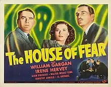 The House of Fear is a 1939 American mystery film directed by Joe May and starring William Gargan, Irene Hervey and Dorothy Arnold. After an actor is killed during the middle of a play the theatre is closed. A year later a young producer re-assembles the cast and re-opens the theatre, intending to the stage the same play performed on the night of the murder.