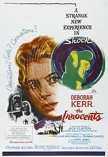 The Innocents is a 1961 gothic psychological horror film directed and produced by Jack Clayton, and starring Deborah Kerr, Michael Redgrave, and Megs Jenkins. Based on the 1898 novella The Turn of the Screw by the American novelist Henry James, the screenplay was adapted by William Archibald and Truman Capote, who used Archibald's own 1950 stage play—also titled The Innocents—as a primary source text. Its plot follows a governess who watches over two children and comes to fear that their large estate is haunted by ghosts and that the children are being possessed.