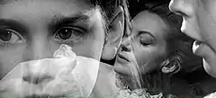An unreliable narrator was originally intended to feature in the narrative and the film was to open with a funeral scene.[18] There are stills of the scene that circulated at the time, but Clayton ultimately elected to open the film with darkness, a song sung by a little girl, and the image of Kerr's hands that are clasped in prayer, with her rosary between her fingers, as she murmurs and sobs.[19] Gradually Kerr's face is highlighted. According to film scholar Frayling, the opening scene creates a sense of intimacy and, perhaps, trust that the governess should be trusted, but the use of darkness surrounding her suggests that it is possible that the story that follows could be nothing more than in her own mind – isolated and creating its own supernatural world.[20]