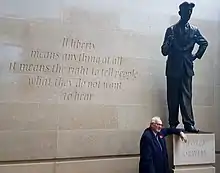 On the 7th November 2017, a statue of Orwell sculpted by Martin Jennings, was unveiled outside Broadcasting House. The idea for the statue and its location came from Ben Whitaker MP who created a Trustee Board of distinguished people to raise the money. Following Ben Whitaker's death in 2014, the fund raising was completed by his widow Baroness Janet Whitaker and the sculpture was commissioned after securing the commitment of the BBC.[23] Baroness Whitaker and Richard Blair delivered short speeches before unveiling the Statue. The wall behind the statue is engraved with the words: "If liberty means anything at all, it means the right to tell people what they do not want to hear", a quote attributed to Orwell's proposed preface to Animal Farm.[24] Baroness Whitaker and the Trustee Board invited The Orwell Society to take over ownership of the Statue. The handover was completed in 2021.[25]