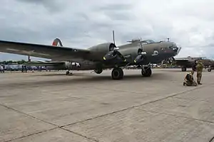 She was featured as the fictional B-17F aircraft Mother and Country in the 1990 film Memphis Belle, she was painted on one side to resemble the older B-17F. She is credited in the 2012 film Red Tails. The Pink Lady was based at Paris–Orly Airport, France, just to the south of Paris, until its hangar was listed for demolition. In October 2006, she was stored for winter 2006–2007 in a hangar in Saint Yan, (Saône et Loire), France. Afterwards, she was based at Melun Villaroche (LFPM), south-east of Paris, where some Dassault (Mirage, Mystère or Balzac) aircraft made their first flights. She has made some appearances, like at Melun in 2008 or the Paris Air Show in 2009. Her last flight from Melun Villaroche (her last base before retirement) was to Cerny-La Ferté Alais (LFFQ) (the airfield of Amicale Jean-Baptiste Salis) in March 2010.[2]
