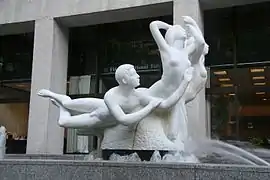 The sculpture was carved in Carrara, Italy, from a single 200-ton block of white Pentelic marble, quarried near Athens.[3] It depicts five "larger than life" nude figures, including three females, one male and one child.[5][6] The statue is set on a pedestal within a fountain, surrounded by water jets.[3] The figures' forms curve upward, and two of the females have their hands raised, while the third "sleeps in the rear".[5] The male figure appears to float and is reaching up with both hands, while the child figure is located behind the foremost female.[5]