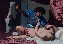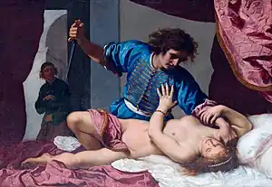 The costume and interior have been updated from ancient Rome to the 17th century, transforming the scene into the recognisable bedroom of a modern Italian home.[1] Aristide Sartorio (1911) provides the following, unsupported anecdote: "[T]he artist's daring innovation of robing Tarquin as a soldier of his day caused some astonishment among our forefathers then unused to such up to date freedoms."[10] However, Titian's Tarquin and Lucretia of 1571 had also depicted contemporary dress. Francesca Baldassari notes the theatrical effect of the gold-fringed maroon and lilac curtains or drapes which frame the action like a play; also the position of the figures, close to the picture plane and slightly above the viewer's gaze.[1]