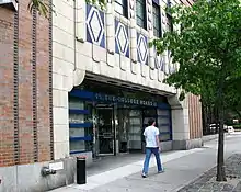 The Sofia's main entrance, on the Columbus Avenue elevation of the facade, contains a two-story-high frame made of multicolored pieces of terracotta.[6][10][12] The main entrance is extremely wide[11] because, when the building was used as a garage, the main entrance was used as an entry ramp for vehicles.[4][6][10] The modern-day entrance functions as a doorway to the offices inside the building.[12] Immediately above the entryway are multicolored Art Deco chevrons and medallions, which are inspired by Aztec designs.[6][10][11] The two-story frame on Columbus Avenue is flanked by black bands of brick. A similar band, decorated with chevrons, runs above the third floor.[6]