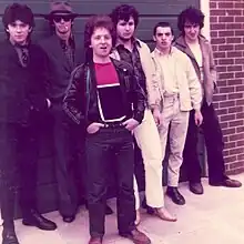 Initially, the band line up was, (as pictured) Steve Garvey then in Buzzcocks, Martin Bramah who was in The Fall at that time, Trevor Wain, Jimmy Donnelly, John Key and Karl Burns who, at that time, was also in The Fall. It was this line-up with the addition of Dave Brisbane that recorded (at Cargo Studios) and released their debut EP, In And Out Of Fashion.[2][3] Because of contractual difficulties with The Fall the band were never able to credit Martin Bramah or Karl Burns on the record sleeve.