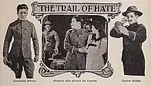 The Trail of Hate is a 1917 American silent drama film that portrayed the military exploits and personal rivalries of two United States Army officers stationed in the American West and later in the Philippines. The production starred John Ford, who at that time was credited as "Jack Ford".[lower-alpha 2] Currently classified as a lost film, this two-reel short is identified by some biographers of John Ford and in many filmographies, both in print and online, to be his second release as a director. He is also credited in various sources for writing the film's screenplay or "scenario".[1] Other Ford biographers, however, most notably American director and film historian Peter Bogdanovich, credit this production's screenplay and its direction to John's older brother Francis Ford.[2][lower-alpha 3]