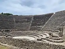 The Large Theatre was built into a natural hill in the second century BC and was one of the first permanent stone theatres in the Roman empire. It sat roughly 5,000 spectators. In the Greek style, the tiered seating extends from the orchestra carved out of the hillside. Around 2 BC, the theatre was renovated and presented to the city of Pompeii as a gift by two relatives, M. Holconius Rufus and M. Holconius Celer, according to an inscription in the theatre. Both of these men were wealthy politicians, and acting as benefactors for the renovation would have helped advance their political ambitions in the city. Additionally, both men had experience in political roles pertaining to the relationship between the colony and the emperor, thus it is also possible the Roman-style renovation of the theatre was in-part done as a tribute to the emperor or to further assimilate Pompeii into the greater Roman Empire.[2] The Roman influence is seen above this gallery where four tiers rested upon an arched corridor.[3] The cavae, audience seating area, was divided into three sections: the lowermost section, the ima, was reserved for senators, magistrates, and other noble people; the middle section, the media, sat the middle class; the top, the summa, was reserved for the plebeians. The tiers on the "ima" were wider and not as steep as the "media" or the "summa" to make it more spacious and comfortable for the higher class. The upper class was also separated from the other seating by a short wall, this was to show the class system, and the divide within the social standings of the classes in Rome.