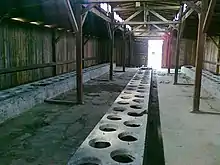 Miroslav Kárný noted that the camp's conditions were described favorably by Auschwitz prisoners in other parts of the camp, but very harshly by prisoners of the family camp itself. He believes that the latter perception is more accurate because the overall mortality rate from "natural" camp deaths was the same at the family camp as the rest of Birkenau.[10] The mortality was to the same causes: hunger, disease, poor sanitation, hypothermia, and exhaustion. Of the September arrivals, 1140 (about 25%) died in the first six months.[8][32][35] BIIb was only 600 by 150 metres (1,970 by 490 ft), "a narrow, muddy strip surrounded by an electric fence", in the words of the Terezín Initiative.[9] Unlike other Jewish prisoners at Auschwitz, they were allowed to receive packages, which they received from the ICRC in Switzerland, as well as friends and relatives in the Czech lands. However, few packages reached their intended recipients, having been stolen by the SS.[36][37] A few children were born at the camp.[38] Sanitary conditions were particularly poor, since there were only three latrines, each with three concrete slabs with 132 holes. The latrines were also used as clandestine meeting places for families, as it was the only place to get away from the SS.[36]