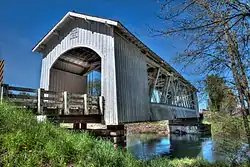 At roughly 5 miles (8 km) upstream of the creek mouth, Gilkey Bridge and a covered railroad bridge next to it crossed the creek at the former community of Gilkey and its Gilkey Station along the tracks of the Southern Pacific Railroad.[18] The road bridge, a 120-foot (37 m) structure of the Howe truss type, was built in 1939, damaged and closed in 1997, repaired and re-opened in 1998.[18] The companion railroad bridge, a 125-foot (38 m) Howe truss span, was removed in 1962.[13] The Gilkey Covered Bridge carries Goar Road over the creek.[7]