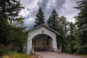 Several covered bridges have spanned Thomas Creek since the late 19th century, some of them replacements for damaged or demolished bridges at the same spots.[13] Three of these bridges—Gilkey, Shimanek, and Hannah—still cross the creek, while two—Weddle and Jordan—have been moved to cities outside the Thomas Creek watershed.[13] The three that still cross the creek are on the National Register of Historic Places (NRHP).[14][15][16] The Weddle Bridge was listed on the NRHP in 1979 but delisted in 1991 after its move to Sweet Home.[17]