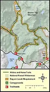 There are also a variety of trails near the lake for hiking and horseback riding. Because Todd Lake is located just outside the Three Sisters Wilderness, it is a major access point for hikers and campers heading into the wilderness. The trailhead for Todd Trail #34 is located at the south end of the lake. Todd Trail connects to Soda Creek Trail #11 from Sparks Lake. It then joins Broken Top Trail #10 running along the south side of Broken Top to Green Lakes Trail #17, which leads north to the Green Lakes at the base of the South Sister. During the summer, dogs must be kept on a leash when hiking on trails in the Three Sisters Wilderness, including all the trails mentioned above. The leash rules also apply to the Todd Lake day-use area, campground, and the trail that follows the shore around the lake.[16][17]