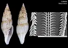 Shell and radula of Tosapusia longirostris (specimen at MNHN, Paris)