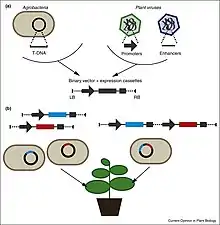 The dominant technology used for the production of transgenic plants for transient expression is Agrobacterium-mediated genetic transformation, or "agroinfiltration," and virus expression machinery.[6] Agrobacterium tumefaciens and related Agrobacterium species are well-known plant pathogens that have been engineered to efficiently transfer specific pieces of DNA (called transfer DNA, or T-DNA) into the plant nucleus using binary vector systems, which consists of a T-DNA binary vector and a vir helper plasmid.[7] This binary vector separates T-DNA from trans-acting virulence proteins that help mediate the transfer.[8] Advantages of this method include modularity of broad host-range plasmids of small size through standard molecular biology techniques. Furthermore, since the parent tumor-inducing plasmid in Agrobacterium strains have been disarmed and only non-reproductive cells have been modified (as opposed to germ-line modifications), the process is considered environmentally harmless.[6]