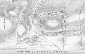Near the village is the site of Y Pigwn. This consists of two overlaying Roman practice marching camps which are on the summit of Trecastle Mountain. They have been described as 'amongst the best-preserved and best-known Roman temporary camps in Wales.[4] The camps were first discovered 1849 and were planned and described by William Rees at the meeting of the Cambrian Archaeological Association at Breconin 1853.[5] Rees also illustrates Bronze Age burial urns which were found by a Mr Holford in nearby burial mounds. The "Y Pigwm" camps are close to the presumed Roman road linking the Roman Forts at Llandovery and Brecon Gaer, and a small Roman fortlet at "Waun Ddu" lies 700m to the West. There are standing stones and a stone circle nearby.