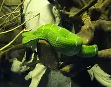Tropidolaemus wagleri, more commonly known as Wagler's pit viper, is a species of venomous snake, a pit viper in the subfamily Crotalinae of the family Viperidae. The species is endemic to Southeast Asia. There are no subspecies that are recognized as being valid.[3] It is sometimes referred to as the temple viper because of its abundance around the Temple of the Azure Cloud in Malaysia.