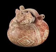 The first scholars of the Tumaco-La Tolita culture thought that its art was nothing more than the representation of the natural environment and daily life.[2] Within this line of thought, it was believed that anthropozoomorphic representations (representations of humans with animal parts) were actually representations of shamans who were undergoing a process of spiritual transformation inspired by the consumption of hallucinogenic plants. But this way of understanding the Tolita art has been questioned by current scholars, who believe that Tolita iconography truly represents the opposite of everyday life:deities, mythological ancestors, supernatural characters, and legendary heroes.[15]