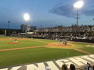 Though UCF baseball first took the field in 1973, its history dates back to 1970 with UCF's club baseball team, the FTU Goldsox.[3][4] The Goldsox played in the Amateur Baseball League of Central Florida and were managed by Jack Pantelias, who led them from 1970 to midway through the 1972 season. When Pantelias resigned, he was replaced by Doug Holmquist, who would lead the team through the end of the season on an interim basis before being named head coach before the 1973 season.[4] Bill Moon was the head coach from 1979 to 1982. The 1979 team was UCFs first championship team – sharing the Sunshine state conference title with Florida Southern University. UCF went 27–16 that year and played in the post season regionals. The team has been nationally ranked at times during the course of 11 seasons, including the highest ranking of No. 7 during both the 2001 and 2012 seasons.[4]