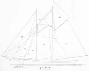 To address these issues, Grampus, although similar in design to the traditional New England schooner, also differed in significant ways.[4] She had a hull 18 to 24 inches (0.5 to 0.6 m)[2] deeper than traditional schooners of similar length, giving her greater stability, and her beam was 6 to 10 inches (0.2 to 0.3 m) less than that of a traditional schooner.[2] She had a straight stem, rather than a raking one, and her stern was narrower and more raked, with her after portion approximating a V-shape, all changes which increased her hull length at the waterline. Her foremast was considerably shorter than her mainmast, and her rigging was designed so that she could carry a double-headed rig forward that allowed her to use a smaller jib that could be furled upon the approach of heavy weather and a fore staysail running from the foremast to near her stem. The result was a ship able to achieve higher sailing speeds, able to make more efficient use of her sails, with no need for crew members to work on her bowsprit during bad weather, and less likely to capsize in heavy seas.[4]