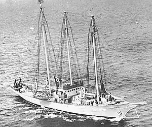 Guinevere was built for Edgar Palmer of New York who specified diesel electric propulsion for what was at the time the largest such yacht built in the United States and the largest fore and aft schooner yacht so far built worldwide.[2] The yacht's power plant consisted of two Winton six cylinder, 350 H.P. diesels directly connected to Westinghouse generators.[3] The generators provided power to a 555-horsepower Westinghouse motor directly coupled to the propeller.[4] Design was by A. Loring Swansey with the diesel electric design in cooperation with a Commander Fisher, USN.[2] The yacht was rated for a speed of 11.5 knots (13.2 mph; 21.3 km/h) under engines alone with 11,000 mile cruising range.[3] A two-ton refrigeration unit, two 15 kilowatt generators, bilge and other pumps, ventilation, power hoists, lights and radio were provided within the electrical system.[2] Batteries provided power at night when the power plant was shut down or in emergencies.[5] Guinevere was built by George Lawley & Son, of Neponset, Massachusetts, and launched April 21, 1921.[3][6][4]