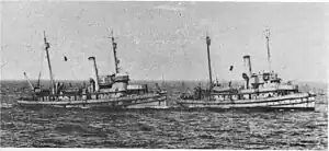![]() USS Patapsco, left, and USS Patuxent, right, participate in minesweeping operations in the North Sea in 1919. They would be designated AT-10 and AT-11 in the United States Navy's new hull code system the following year. | |