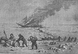 Rodgers then drifted up the bay, her rigging and sails ablaze. Early the next day her magazine exploded. A temporary shore camp sheltered the crew until the next day when they moved to the village of Noomamoo, seven miles (10 km) away. Later divided into four parties, most of the crew wintered there and in three nearby villages.