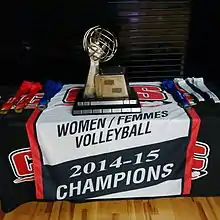 The U Sports Women's Volleyball Championship is a Canadian university volleyball tournament conducted by U Sports, and determines the women's national champion. The tournament involves the champions from each of Canada's four regional sports conferences.[1] The championship trophy, first awarded in 1977, features a two-wheeled oxcart, symbolizing the pioneer era on the Red River in Manitoba.[2] The 2023 champions are the UBC Thunderbirds who have also won the most championships with a total of 13, including six in a row from 2008 to 2013.[2][3]