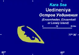 Uyedineniya Island (also Uedinenia, Russian: Остров Уединения; Norwegian: Ensomheden) is an island located in the central part of the Kara Sea, roughly midway between Novaya Zemlya and Severnaya Zemlya. Its latitude is 77° 29' N and its longitude 82° 30' E. It is often labelled as Einsamkeit Island (from the German Insel der Einsamkeit) as well as Lonely Island or Solitude Island in English maps.[1]