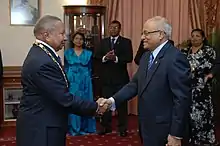 Zahir receiving the Order of Distinguished Rule of Izzuddin from President Gayoom
