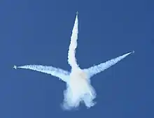 The three memorial spires range from 201 feet (61 m) to 270 feet (82 m) high and appear to be soaring; its array of stainless steel arcs against the sky evokes the image of "contrails of the Air Force Thunderbirds as they peel back in a precision 'bomb burst' maneuver." Only three of the four contrails are depicted, at 120 degrees from each other, as the absent fourth suggests the missing man formation traditionally used at Air Force funeral flyovers.[5]