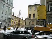 Joanneum Quarter under construction – Neutorgasse building (right) and the rear of the Lesliehof (center-left).