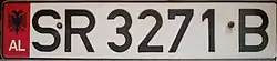 Plate with DIN 1451 font issued from 1995 to 2002. 'SR' stands for Sarandë District. Note the inclusion of the national identification strip on the left