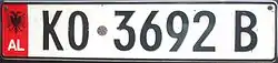 Plate with smaller font and regional code issued from 2002 to 2011. 'KO' stands for Korçë District. Old plates are still valid even though new plates were introduced