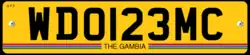 Rear Plate: 27x20 cm Black on yellow Bottom strip in Gambian Flag Text in the center bottom, saying The Gambia |