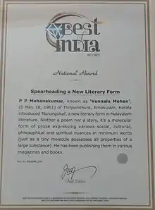 • 2020 - Spearheading a New Literary Form - Vennala Mohan features in Best-of-India Records (BIR) [3][4]