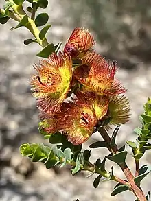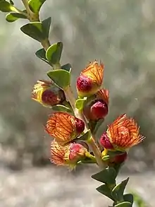 The flowers are scented and arranged in spike-like groups on erect stems 1.5–2 mm (0.06–0.08 in) long and the flowers open at about the same time as each other. The floral cup is top-shaped, about 3 mm (0.1 in) long, has 5 ribs and is glabrous and smooth. The sepals are deep red in colour, or deep red with yellow, 4–5.6 mm (0.16–0.22 in) long, with 10 to 12 feathery lobes. The petals are golden-yellow with red spots, egg-shaped, 5–7 mm (0.2–0.3 in) long, about 2.5 mm (0.1 in) wide with a fringe 1.5–2.5 mm (0.06–0.1 in) long and with deeply-divided, ear-shaped appendages. The style is about 6 mm (0.2 in) long, bent and has long hairs on its sides. Flowering time is from late October to December.[2]
