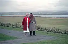 During the Reykjavík Summit, President Ronald Reagan walks with Vigdis at Bessastaðir
