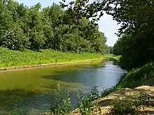 Upon entering Indiana, the river has many sharp turns; these regularly lead to log jams that can block the river. Because of the many turns in the river, during the 1830s, the state created several separate canal channels to shorten the journey between the state line and Fort Wayne as part of the Wabash and Erie Canal project. The canals were abandoned after competing railroads took over; this allowed the river to shift courses several times, resulting in the formation of many cut-offs and coves with no outlet. The river has a maze-like quality in the first seventeen-mile (27 km) stretch as it enters Indiana.[13]