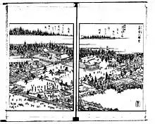 Historic print with an aerial view of the shrine, from the Owari meisho zue (1880)