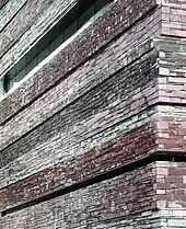 The exterior of the building is clad in multi-coloured slate collected from Welsh quarries. Narrow windows are built into the layers of slate to give the impression of rock strata in sea cliffs. The purple slate came from the Penrhyn Quarry, the blue from Cwt y Bugail Quarry, the green from the Nantlle Valley, the grey from Llechwedd quarry, and the black from the Corris Quarry.[28]