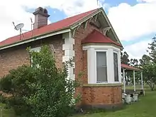The Station Master's house faces the Sydney platform and is constructed of brick. It is an asymmetrical villa, being constructed in a L-shape with faceted bay in the projecting wing, posted verandah (reconstructed), stuccoed quoins and decorative brackets to the gable ends, and prominent chimneys.[1]