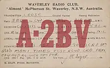 The Waverley Radio Club was founded on 27 January 1919 by a group of 17 radio experimenters and enthusiasts living in the Waverley area and allocated license number N249 by the navy department. In 1922, when the Postmaster-General's Department took over licensing, the club call letters (as they were then known) were changed to 2BV and in 1929 national prefixes were adopted so becoming the call sign VK2BV.[2]