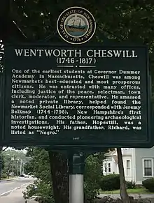 - ↑ "Roadside History: Wentworth Cheswill (1746-1817), 'New Hampshire's first historian'". New Hampshire Union Leader. 4 June 2017. Retrieved 9 July 2019.