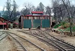 In the late 1970s, Glen Bell, the founder of the Taco Bell restaurant chain opened a tourist railroad at Tuolumne.[6] This 3 ft (914 mm) gauge railroad used the lower section of the track and several steam locomotives of the West Side Lumber Company railway. The operation also offered boat rides on the old mill pond and RV parking. It closed in the early 1980s after failing to attract enough visitors.[7]