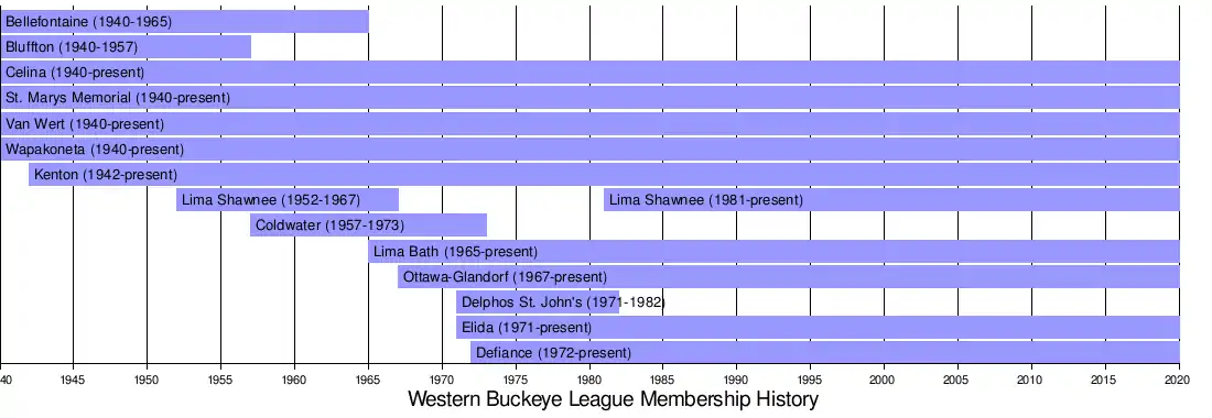 - The charter members of the league in 1940-1941 were Bellefontaine, Bluffton, Celina, St. Marys, Van Wert and Wapakoneta.