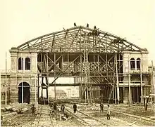 Stuttgart professor of architecture Wilhelm Sophonias Bäumer was commissioned by the Northwest Railway Construction Department to build the passenger station, after he had been invited to submit a draft in 1869.[14] The specification was a station with five tracks, which can be extended if required. It was not yet clear how the northwest railway would develop. Construction of the hall began in January 1870,[15] with Bäumer being supported in the construction phase until 1873 by Theodor Reuter as site manager, who at that time was chief engineer in the central office for building construction of the Northwest Railway.[16] Bäumer, who moved his residence to Vienna for the project, also developed large residential buildings in the vicinity (Heinestraße 41 / Praterstern 1 / Kleine Stadtgutgasse 12 and 14) as well as some villas in the surrounding area of Vienna and Carinthia during the construction supervision for the construction of the railway station.[17]