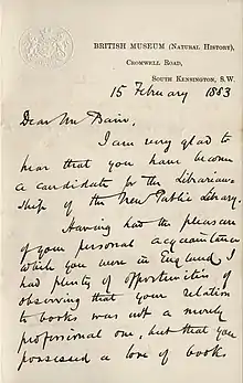 Hand-written letter from Carruthers in 1883, to James Bain